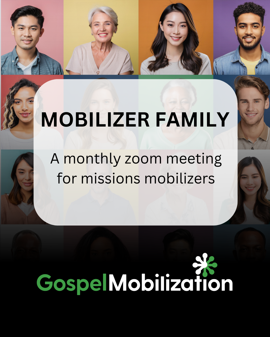 Join the Gospel Mobilization monthly zoom meetings called, The Mobilizer Family. It’s for any and all missions mobilizers to attend. Hosted by our Chief Servant Officer, Dave Jacob, you'll be encouraged and equipped to mobilize more missionaries through your ministry.